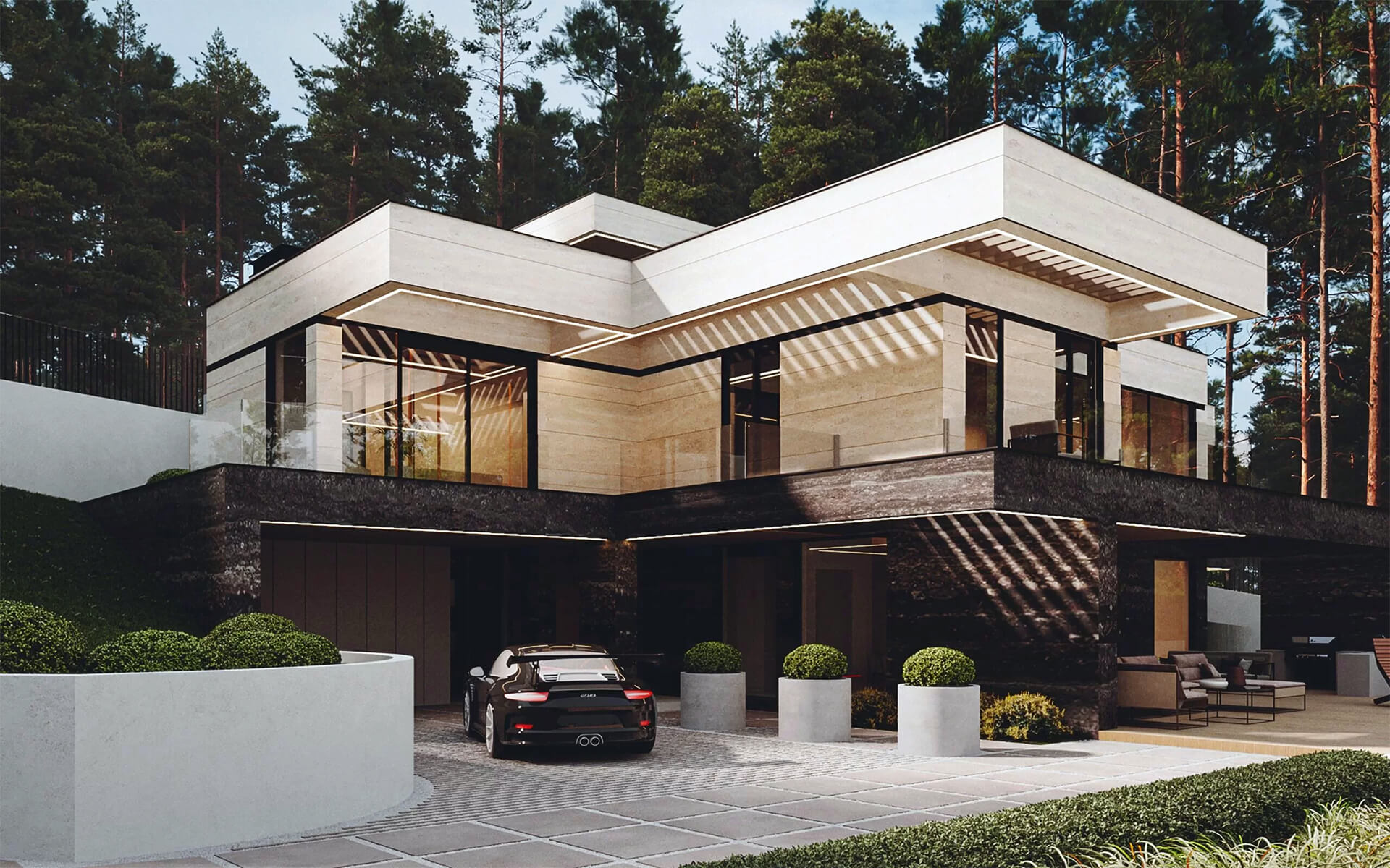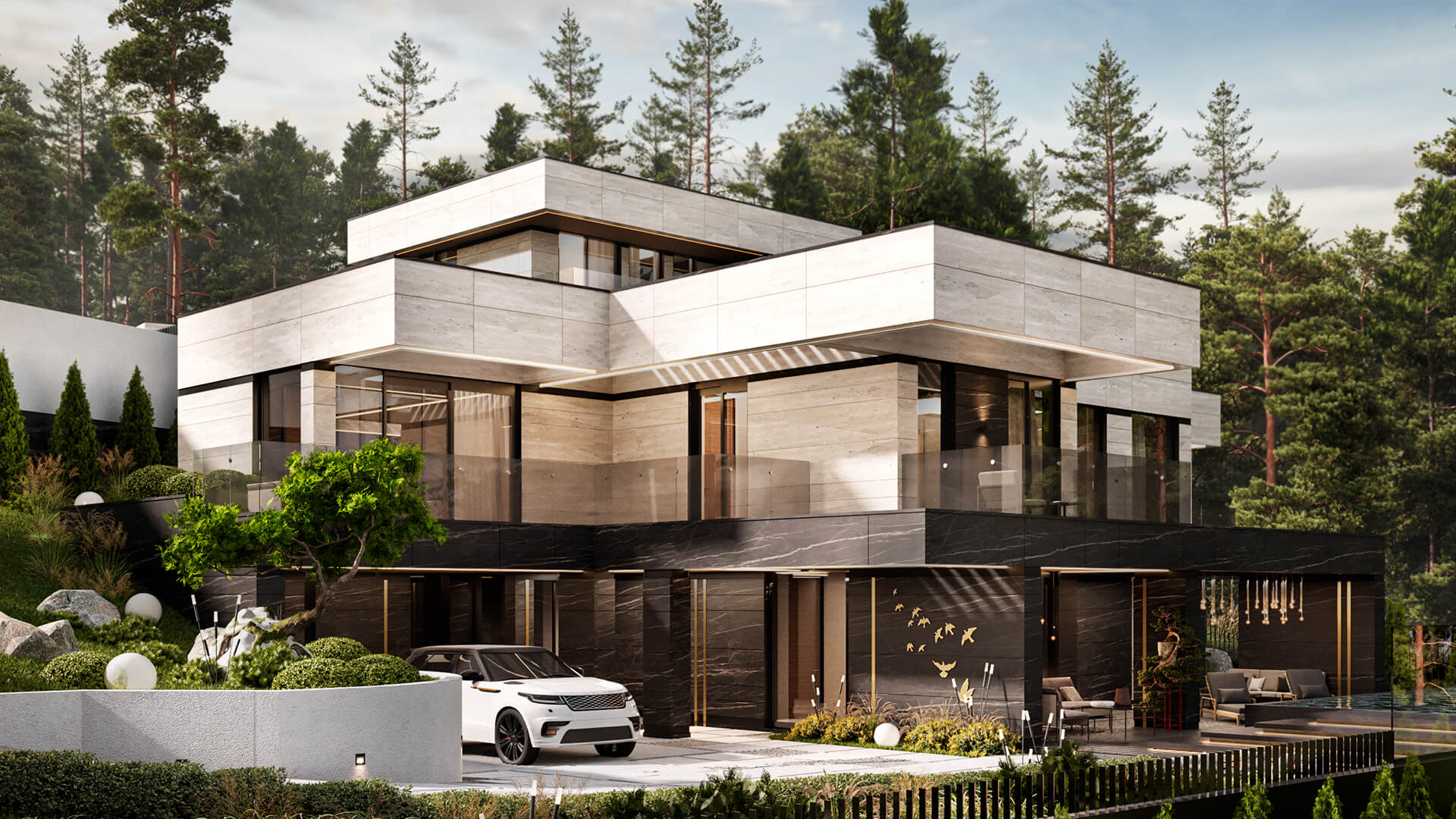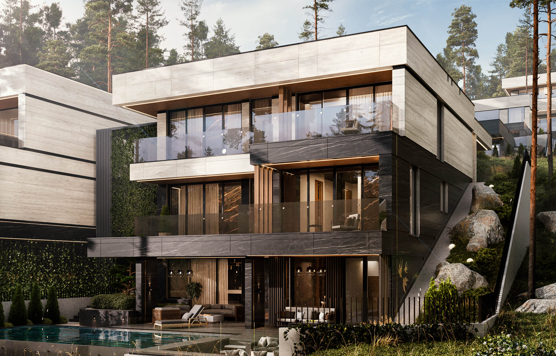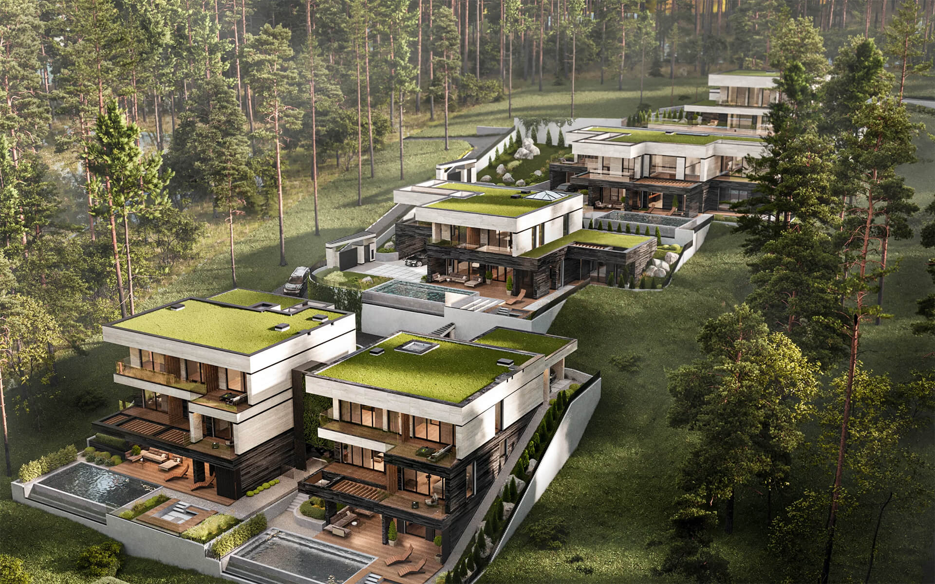 Архитектурная концепция поселка «Баланс» представляет собой гармоничное сочетание современного дизайна, функциональности и естественной среды. Виллы выполнены в лаконичном стиле с чистыми геометрическими формами, большими панорамными окнами и террасированными зелеными кровлями, которые плавно перетекают в природный ландшафт. Использование натуральных материалов, таких как камень, дерево и стекло, подчеркивает единство с окружающей средой и делает дома органичной частью пейзажа.